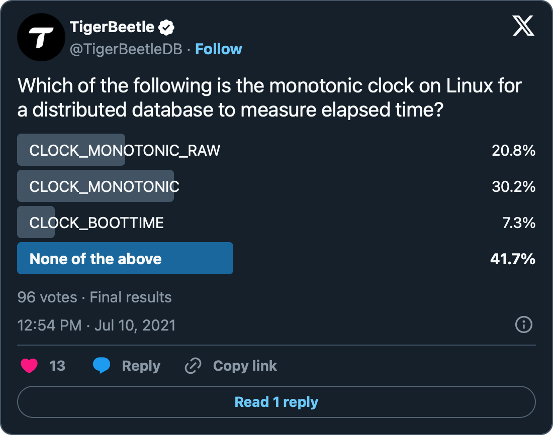 We recently had the pleasure of presenting TigerBeetle on Zig SHOWTIME, where we ran a live Twitter poll to ask: Which Linux monotonic clock “stopwatch” is best to measure elapsed time?