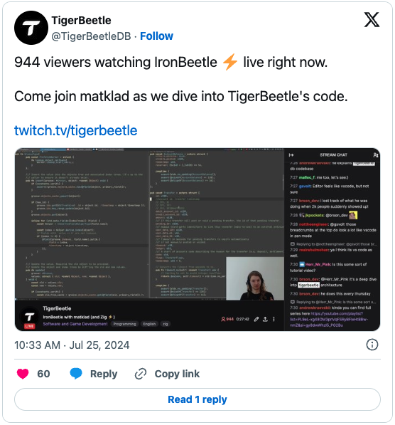 The last two episodes both had more than 2,000 people joining matklad live on Twitch to walk through TigerBeetle code.